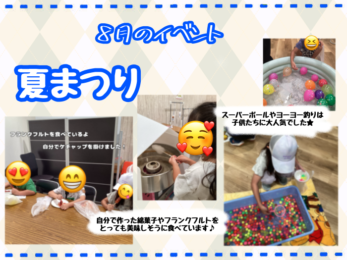 子供たちが自分で作ったゴム鉄砲を使って的当てをしたり、スーパーボールやヨーヨー釣り、綿菓子やフランクフルトも自分で作って食べたりと、とても楽しみながら色んなことに積極的に挑戦する様子がみられました☆