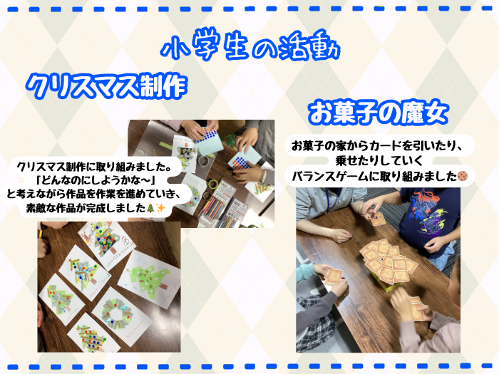 あっという間に時がたち、今年も残りわずかとなりました。この1年を振り返り、子どもたちの成長を感じるこの頃です。子どもたちは冬休みにクリスマスにお正月、とこの時期特有のお楽しみが多いようでした。そんな子どもたちの活動の様子をお伝えします。