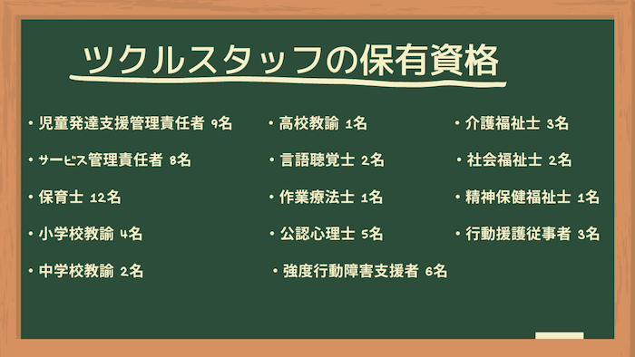 ツクルでは様々な資格を持つ職員が働いています、今回はどのような資格があるのかご紹介していきたいと思います。
