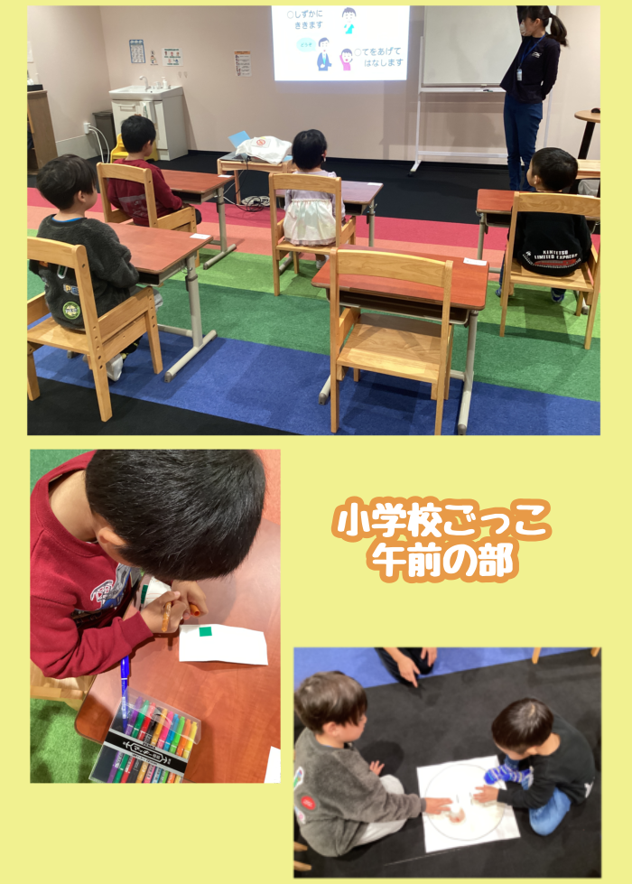 まとめとして、学校には色々な授業があることも聞き、小学校ごっこを終えています。今日のように、お友だちや先生と楽しみながら学校生活を送っていってくれたらと思います。