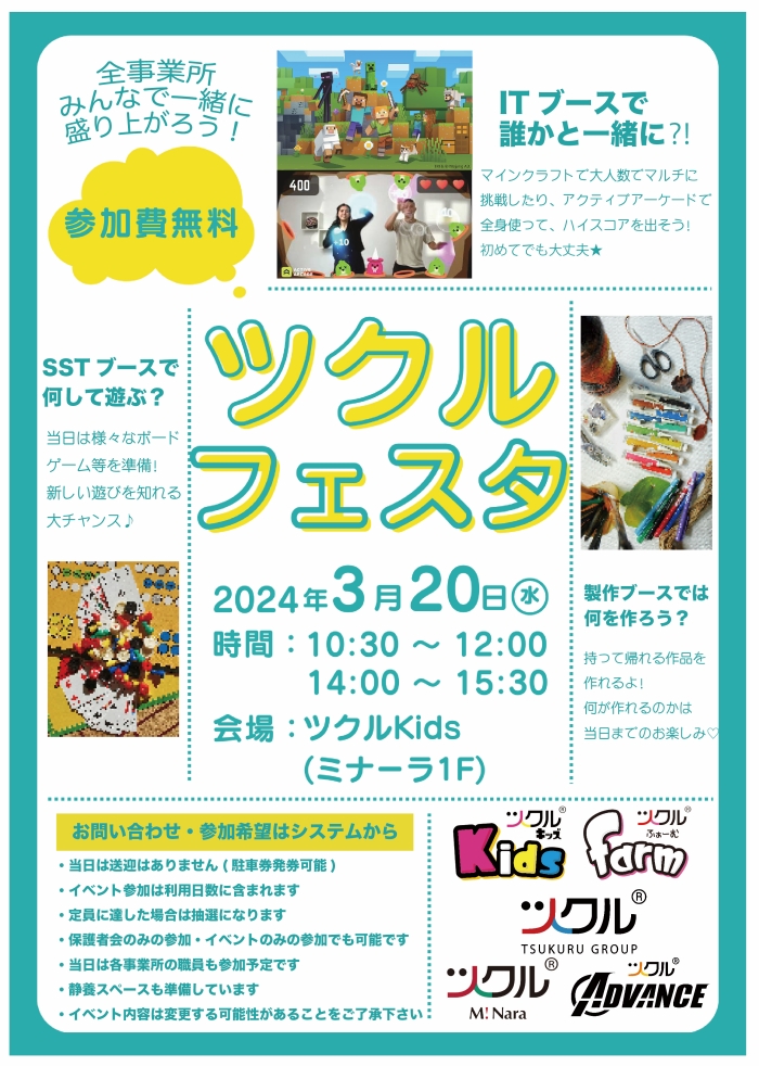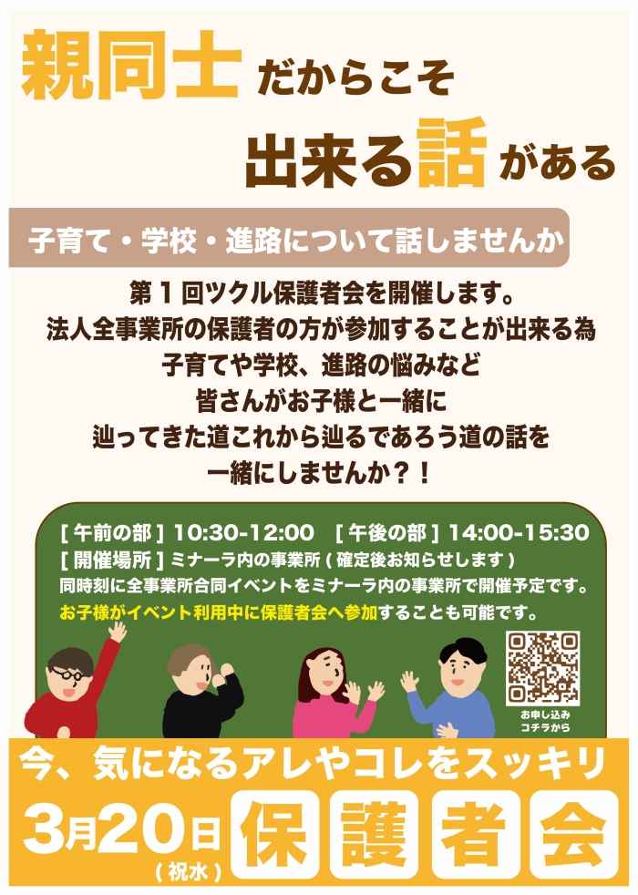 ホーム > ツクルグループのお知らせ > 全事業所合同☆保護者会&イベント開催 全事業所合同☆保護者会&イベント開催 2024年1月23日 シェア ツイート シェア はてブ シェア この度、第1回ツクル保護者会を2024年3月20日(祝水)に開催することとなりました! また同時刻には利用児童が参加できるイベントをミナーラ内で開催予定です。 是非、是非ご参加ください☆