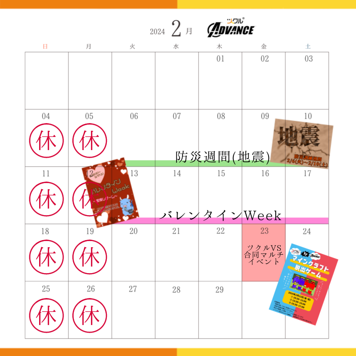 防災週間は自分の身を守れるようにどう行動するかをみんなで考える機会に、バレンタインWeekはちょっとしたゲームを予定しています♡