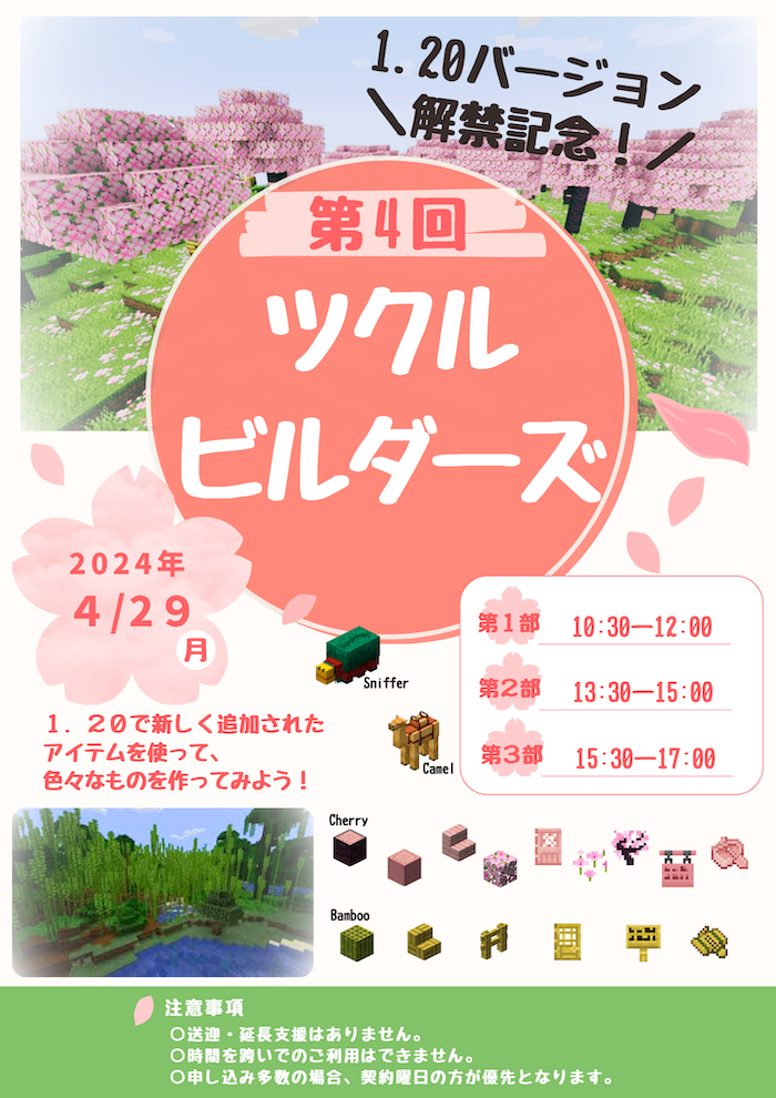 マインクラフトバージョン1.20で追加された桜のブロックを活用して、みんなで素敵な建築をしましょう♪