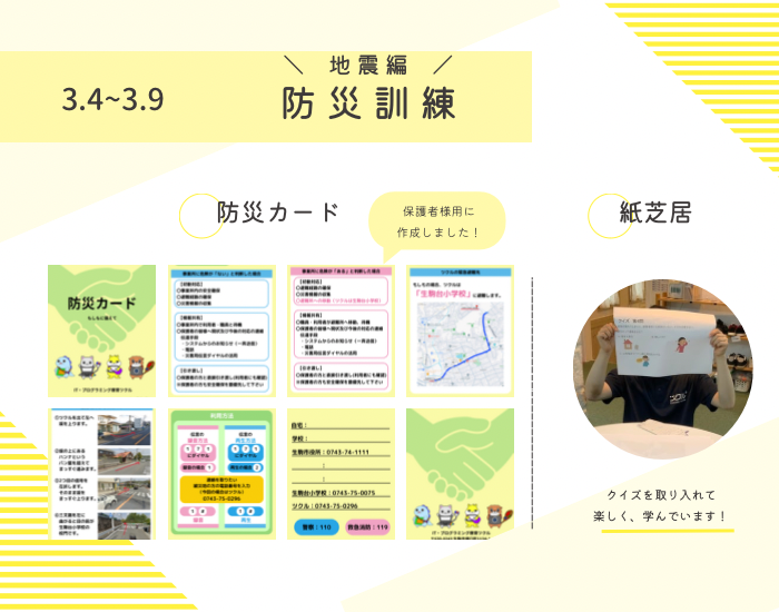 保護者の方にも、緊急時の対応について確認し、対応できるように作った防災カードをお渡ししています!