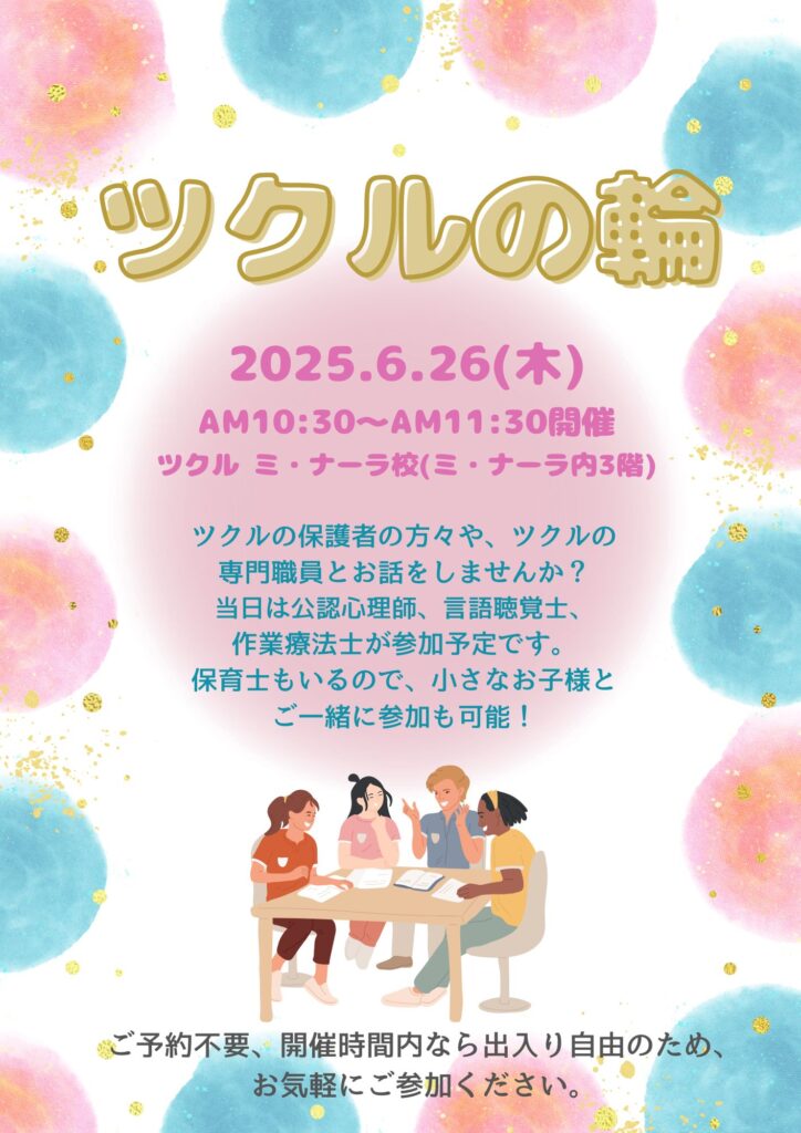 2025年6月26日(木)に全事業所の保護者様対象のツクルの輪をツクル ミ・ナーラ校(ミ・ナーラ内3階)10時30分〜11時30分に開催いたします!