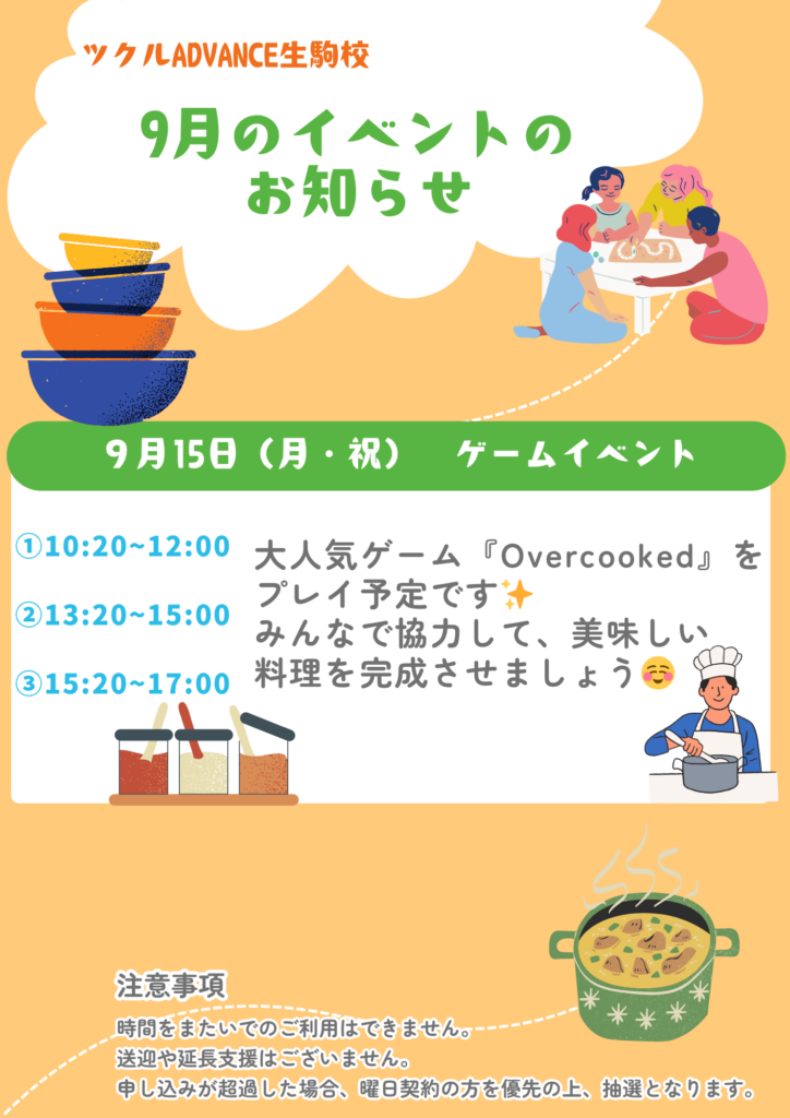 9月15日(月・祝日)にゲームイベントを開催します!ゲーム内容は大人気『Overcooked』です✨