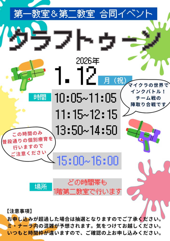 1月12日にクラフトゥーンイベントを開催します。マインクラフトの世界で、あの大人気インクバトルゲームをプレイ!!