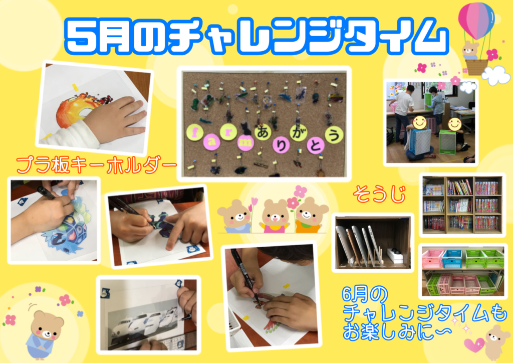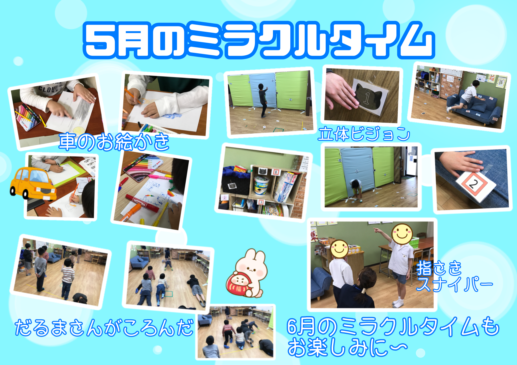5月に取り組んだ感覚統合訓練(ミラクルタイム)と生活スキル向上訓練(チャレンジタイム)の紹介です✨