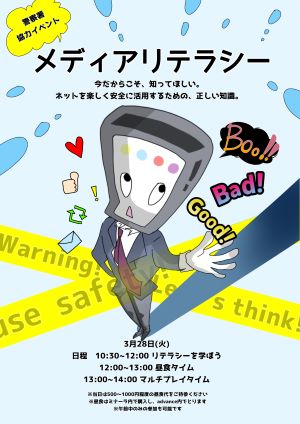 3月28日(火)に、奈良県警察署から講師の方をお招きしてメディアリテラシーについてのお話を聞き、安全な使い方について考えるイベントを実施します。