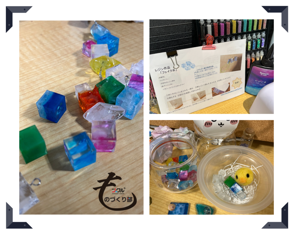 レジンの中に綿やティッシュの切れ端を入れて本物に寄せてデザインしています