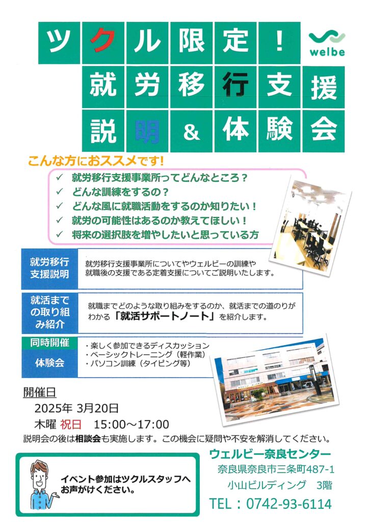 3月20日(木)祝日に就労移行支援ウェルビーさんと合同で説明&体験会を開催いたします!