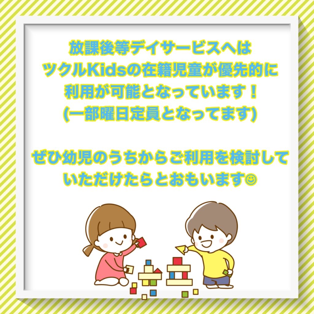 ホーム > ツクルグループのお知らせ > ツクルKidsお知らせ > ★来年度利用希望幼児さん体験募集★ ★来年度利用希望幼児さん体験募集★ 2024年11月19日 シェア ツイート シェア はてブ シェア 児童発達支援ツクルKidsでは来年、年少児、年中児、年長児の体験・見学を開始しています!