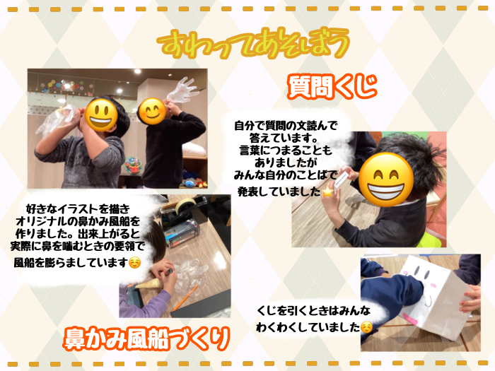 鼻をかむ練習として鼻かみ風船を作ったり、質問くじでコミュニケーションを取ったり楽しんでいます。