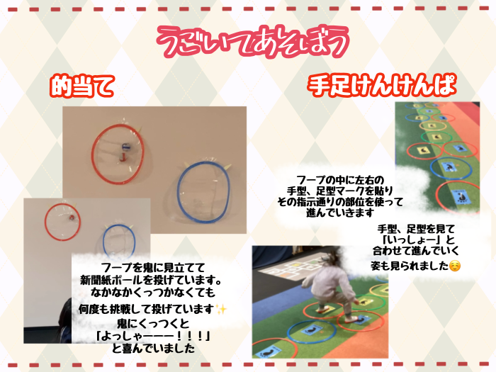 節分にちなんで的あて(豆まき)や、手足けんけんぱ等に取り組みました。